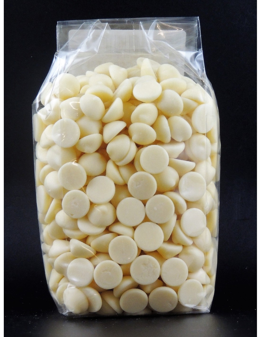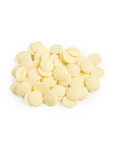 Chocolat blanc (22,5% cacao min) Ingrédients: sucre, poudre de LAIT entier, beurre de cacao, émulsifiant: lécithine de SOJA; arôme naturel de vanille.