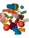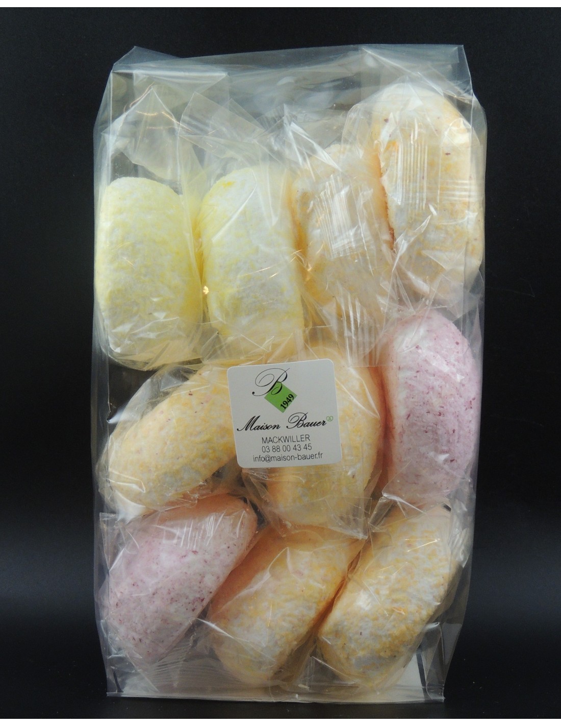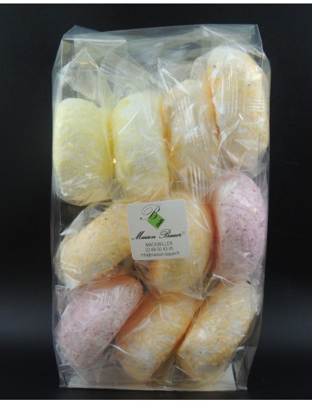 Ingrédients: sucre, noix de coco râpée (10%), sirop de glucose, amidon de maïs, gélatine, protéines de LAIT hydrolysées, arôme, colorants: extrait de paprika, lutéine; concentrés végétaux: radis, pomme, cassis.